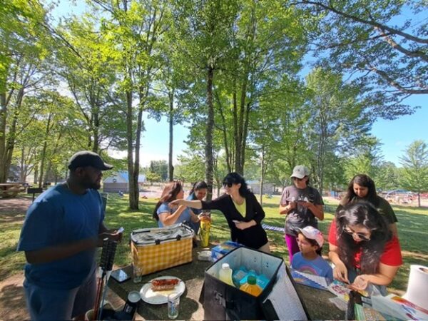 Students played some games, including a lively Dad Joke Face-Off (with lots of laughs!) and of course: chess! In the morning, a few people brought a basketball and badminton rackets, which added to the fun. Everyone had some delicious food to share, and many students took the opportunity to exchange recipes and talk about the dishes they had prepared. There was also a barbecue, and the students took turns helping with the preparation, which gave everyone a chance to collaborate and chat…all in English!